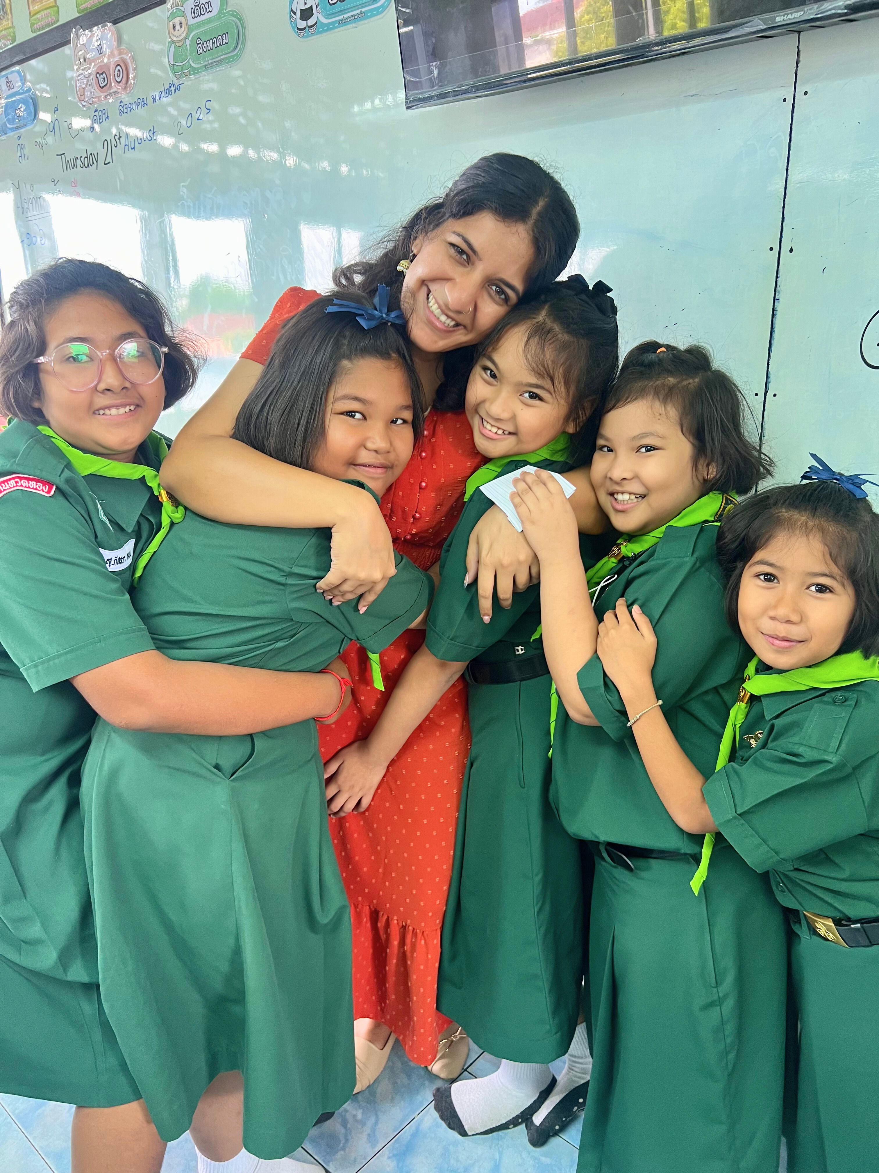 The first words I heard at Ban Thuad Thong School were, “Teacher India?” As someone who moved from India to the U.S. at a young age, my identity has always been central to how I see the world, and how the world sees me. Here, it has become a bridge between my students’ curiosity and my heritage, as I use the opportunity to teach about both my birthplace and the place I now call home. Last semester, one sixth grader began greeting me with “Namaste” after learning it was used in India. I felt deeply touched that he’d gone out of his way to learn a greeting from my mother tongue, and gave me a reminder of my roots. The feeling of being away from my community is something I share with the other foreign English teachers at my school as well: Teacher Joy from Kenya, Teacher Leslie from the Philippines, and Teacher Kami from India, who grew up in a town a few hours away from where I was born! Together, we swap languages, food, and stories from our cultures, building friendships that make daily life lighter. They remind me that even while far from our families, we have created our own home here – one built on community, support, and shared purpose, while still honoring our identities.